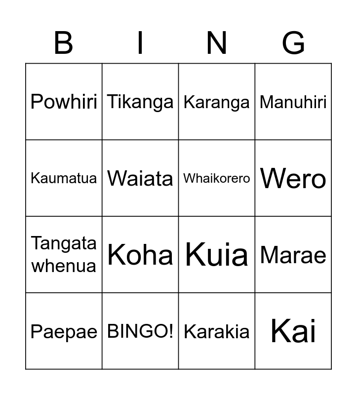 This bingo card has 16 words: BINGO!, Marae, Karanga, Powhiri, Tangata whenua, Tikanga, Kuia, Karakia, Kaumatua, Waiata, Paepae, Manuhiri, Koha, Wero, Whaikorero and Kai.