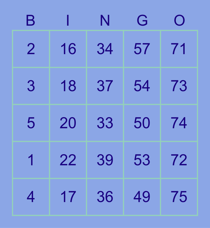 This bingo card has 25 words: 1, 17, 33, 49, 71, 2, 16, 34, 50, 72, 3, 18, 36, 53, 73, 4, 20, 37, 54, 74, 5, 22, 39, 57 and 75.