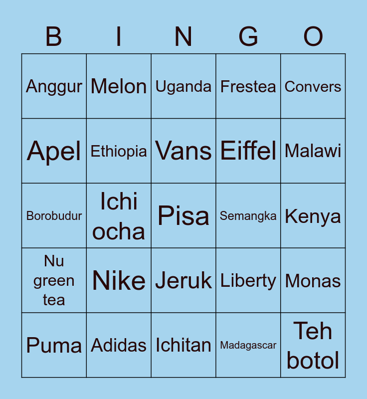 This bingo card has a free space and 24 words: Nike, Adidas, Vans, Puma, Convers, Anggur, Apel, Melon, Semangka, Jeruk, Eiffel, Borobudur, Liberty, Monas, Ethiopia, Madagascar, Kenya, Uganda, Malawi, Ichi ocha, Teh botol, Nu green tea, Frestea and Ichitan.