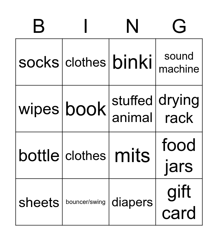 This bingo card has 18 words: clothes, gift card, binki, socks, mits, sound machine, sheets, clothes, drying rack, bottle, diapers, wipes, food jars, book, stuffed animal, swaddle, bouncer/swing and diaper cream.