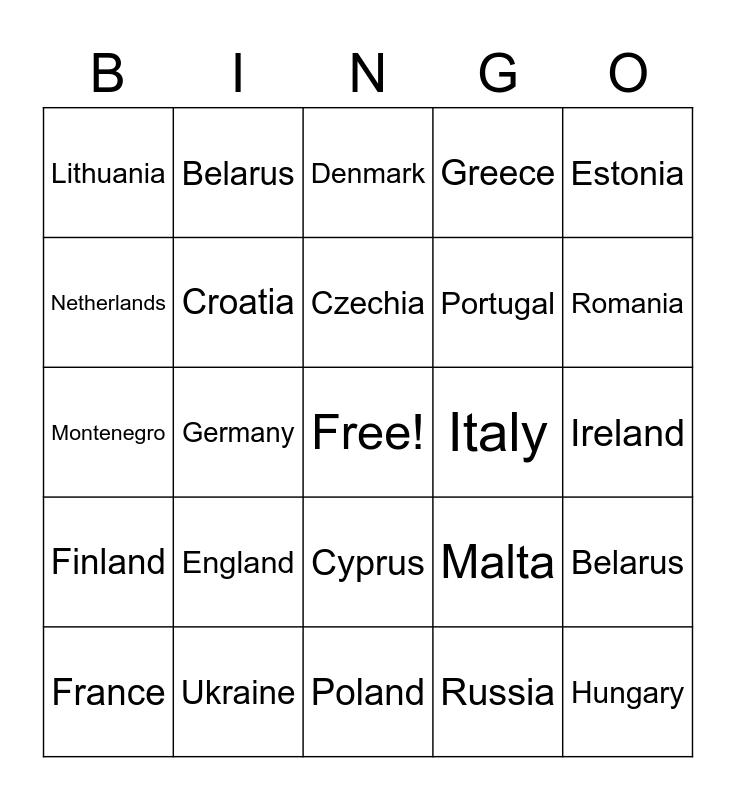 This bingo card has a free space and 39 words: Austria, Belgium, Bulgaria, Croatia, France, Cyprus, Czechia, Denmark, Estonia, Finland, Germany, Greece, Hungary, Ireland, Italy, England, Latvia, Lithuania, Luxembourg, Malta, Netherlands, Poland, Portugal, Romania, Slovakia, Slovenia, Spain, Sweden, Norway, Belarus, Serbia, Switzerland, Denmark, Ukraine, Russia, Albania, Belarus, Montenegro and Belgium.