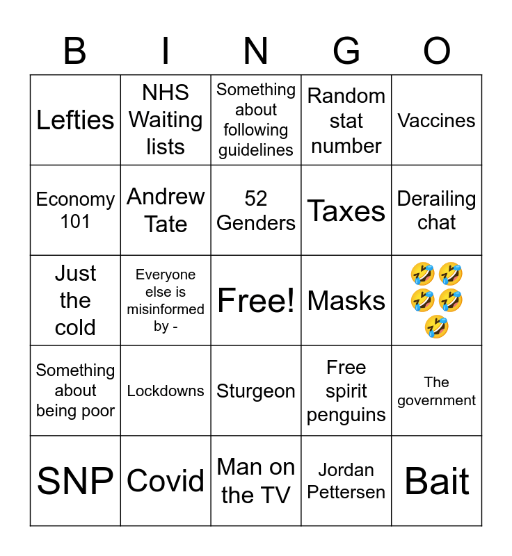 This bingo card has a free space and 24 words: Lockdowns, Covid, 52 Genders, SNP, Vaccines, Lefties, Economy 101, NHS Waiting lists, Masks, Sturgeon, Taxes, Just the cold, Free spirit penguins, The government, Andrew Tate, Jordan Pettersen, 🤣🤣🤣🤣🤣, Something about following guidelines, Derailing chat, Everyone else is misinformed by -, Bait, Something about being poor, Random stat number and Man on the TV.