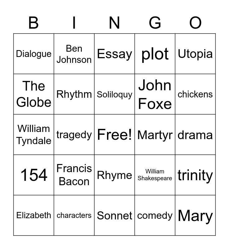 This bingo card has a free space and 24 words: Francis Bacon, characters, Soliloquy, Elizabeth, Utopia, Dialogue, The Globe, Ben Johnson, Martyr, Rhyme, John Foxe, William Tyndale, William Shakespeare, trinity, Rhythm, comedy, drama, Essay, chickens, tragedy, Mary, 154, plot and Sonnet.