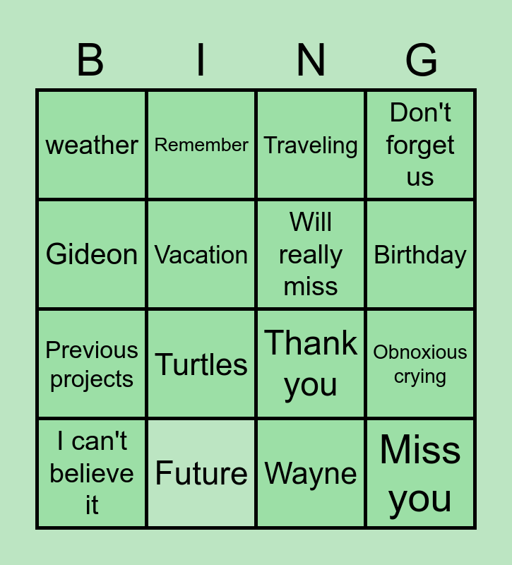 This bingo card has 18 words: Turtles, Miss you, Traveling, weather, Thank you, Don't forget us, I can't believe it, Remember, Birthday, Previous projects, Wayne, Gideon, Obnoxious crying, Vacation, Will really miss, Excited, Future and Weather.