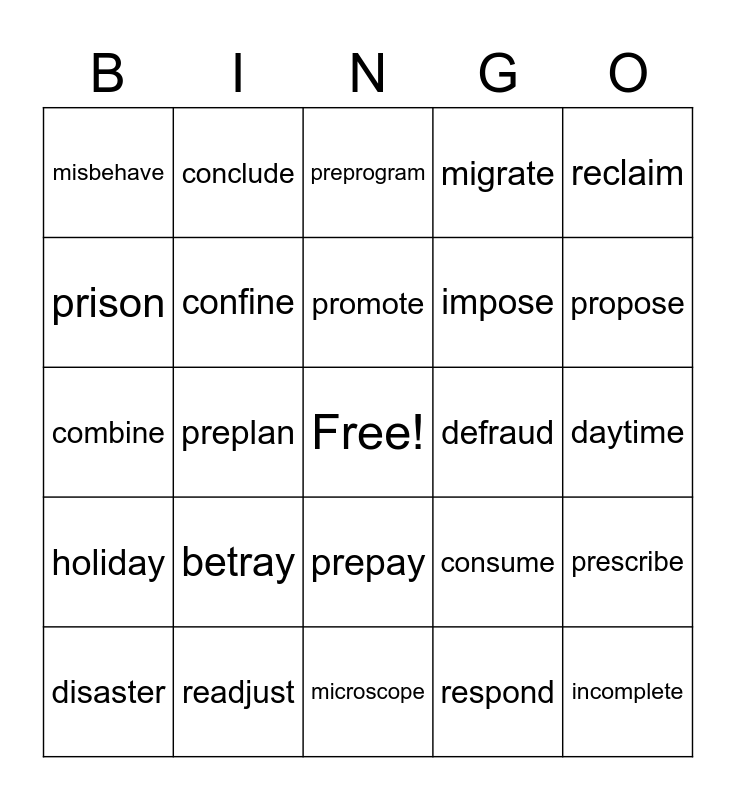 This bingo card has a free space and 24 words: betray, readjust, promote, disaster, reclaim, misbehave, prison, conclude, defraud, prepay, impose, combine, consume, prescribe, confine, respond, daytime, preprogram, propose, preplan, incomplete, holiday, migrate and microscope.