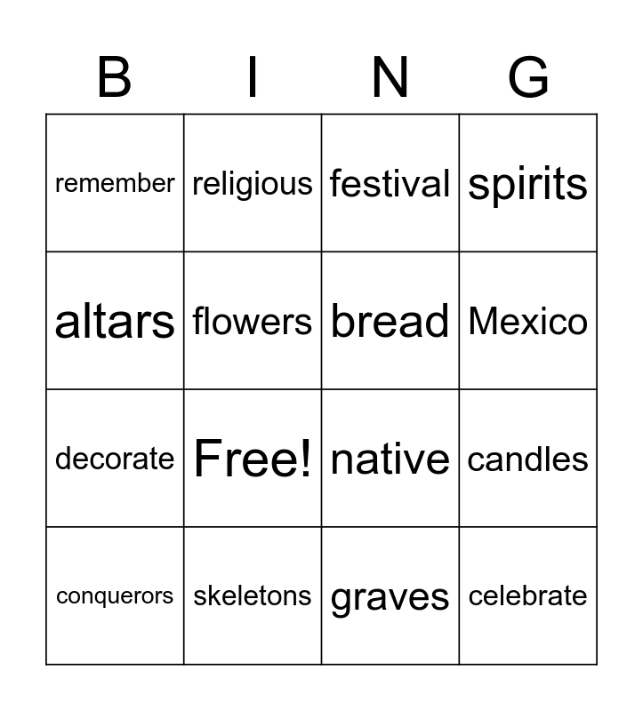 This bingo card has 18 words: Free!, celebrate, festival, remember, native, spirits, conquerors, religious, Mexico, decorate, graves, altars, candles, flowers, bread, photos, skeletons and skulls.
