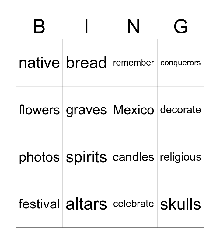 This bingo card has 17 words: celebrate, festival, remember, native, spirits, conquerors, religious, Mexico, decorate, graves, altars, candles, flowers, bread, photos, skeletons and skulls.