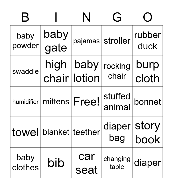 This bingo card has a free space and 49 words: bassinet, diaper, bottle, car seat, blanket, booties, baby gate, wipes, swaddle, crib, high chair, stroller, story book, diaper bag, baby monitor, night light, baby lotion, stuffed animal, pacifier, rubber duck, mittens, changing table, baby powder, rocking chair, bath tub, burp cloth, baby clothes, thermometer, teether, towel, hat, spoons, sippy cup, brush, bib, play gym, nail clippers, mobile, bonnet, bouncer, swing, walker, wash cloth, diaper cream, humidifier, pajamas, play mat, shoes and toy box.