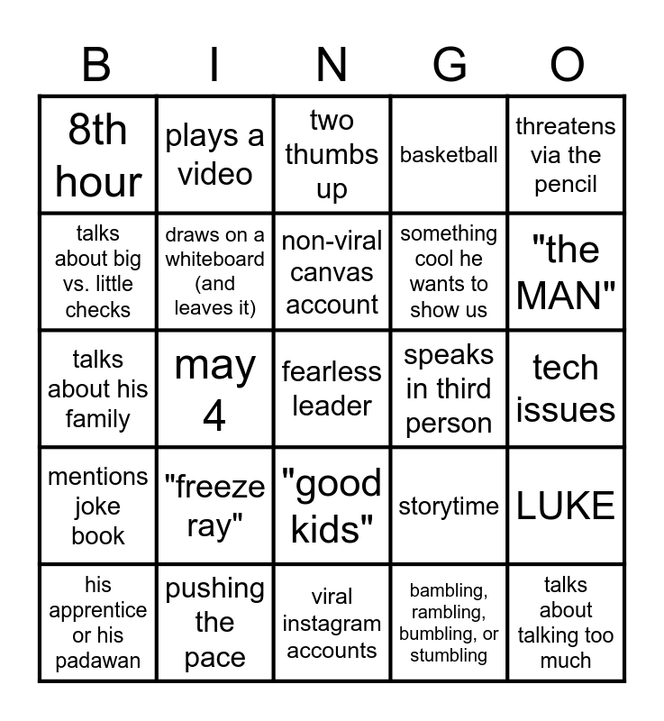 This bingo card has 38 words: Free!, "am I making sense?", "anyone, anyone", draws on a whiteboard (and leaves it), LUKE, "freeze ray", non-viral canvas account, "you're good, you're smart", threatens via the pencil, something cool he wants to show us, may 4, basketball, fearless leader, tech issues, talks about big vs. little checks, mentions joke book, mentions techie/teacher of the month, two thumbs up, "zietse", speaks in third person, 8th hour, pushing the pace, "the MAN", his apprentice or his padawan, deviates from the lesson plan, viral instagram accounts, talks about talking too much, being "crabby", going soft in his old age, the squeaky marker, geometry, "good kids", bambling, rambling, bumbling, or stumbling, plays a video, talks about how much fun we have, storytime, talks about his family and makes a bad joke.