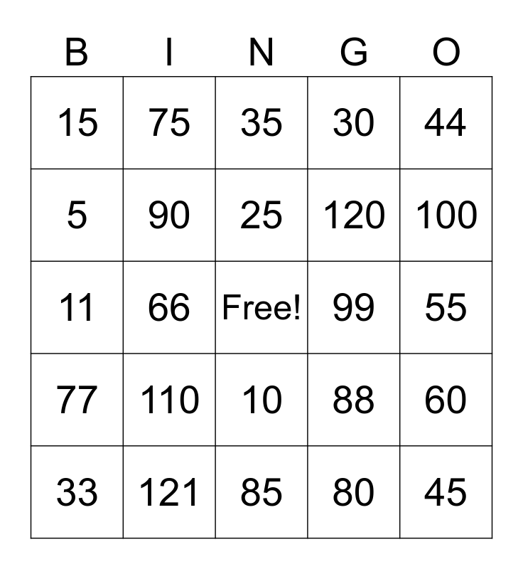 This bingo card has a free space and 29 words: 33, 50, 66, 132, 15, 35, 90, 110, 99, 121, 55, 45, 85, 80, 100, 20, 10, 77, 44, 11, 88, 40, 120, 5, 30, 75, 60, 25 and 70.