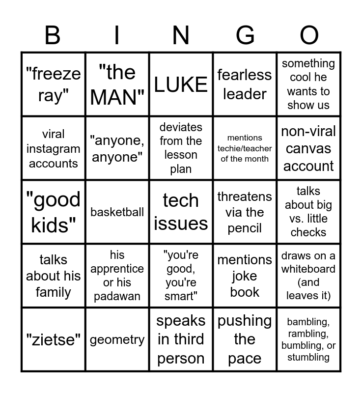 This bingo card has 37 words: talks about talking too much, being "crabby", going soft in his old age, "anyone, anyone", draws on a whiteboard (and leaves it), his apprentice or his padawan, deviates from the lesson plan, "am I making sense?", something cool he wants to show us, may 4, basketball, fearless leader, tech issues, talks about big vs. little checks, viral instagram accounts, talks about his family, makes a bad joke, LUKE, "you're good, you're smart", threatens via the pencil, "freeze ray", non-viral canvas account, "zietse", speaks in third person, 8th hour, pushing the pace, "the MAN", plays a video, talks about how much fun we have, storytime, the squeaky marker, geometry, "good kids", bambling, rambling, bumbling, or stumbling, mentions joke book, mentions techie/teacher of the month and two thumbs up.