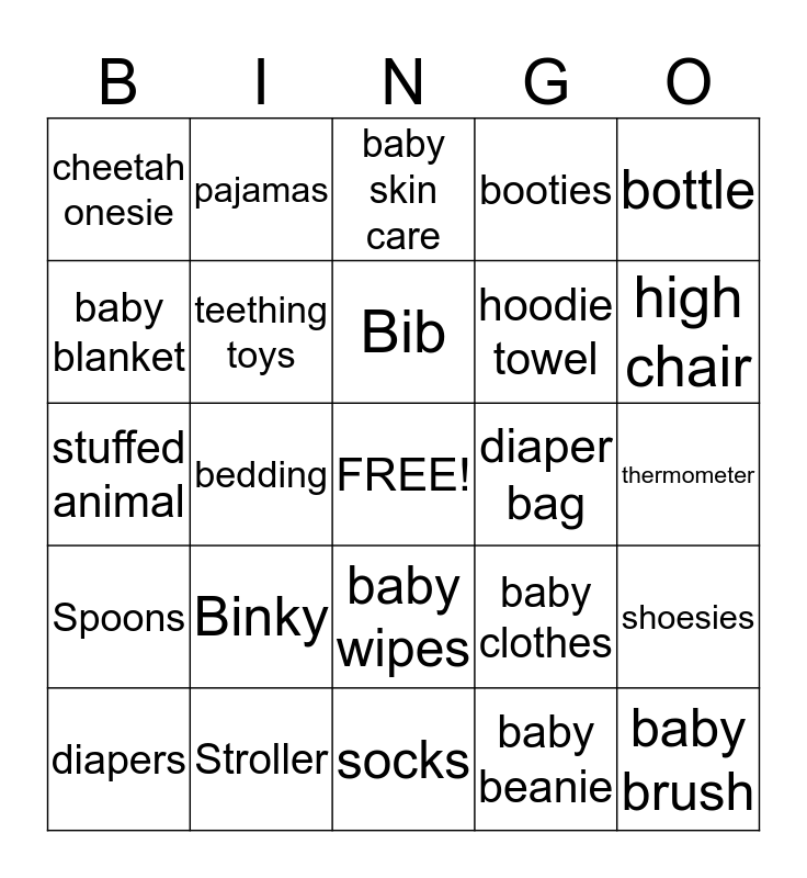 This bingo card has a free space and 24 words: Binky, Stroller, Bib, diapers, bottle, cheetah onesie, baby blanket, pajamas, diaper bag, baby wipes, hoodie towel, stuffed animal, baby clothes, shoesies, teething toys, baby beanie, thermometer, baby skin care, high chair, bedding, baby brush, Spoons, booties and socks.