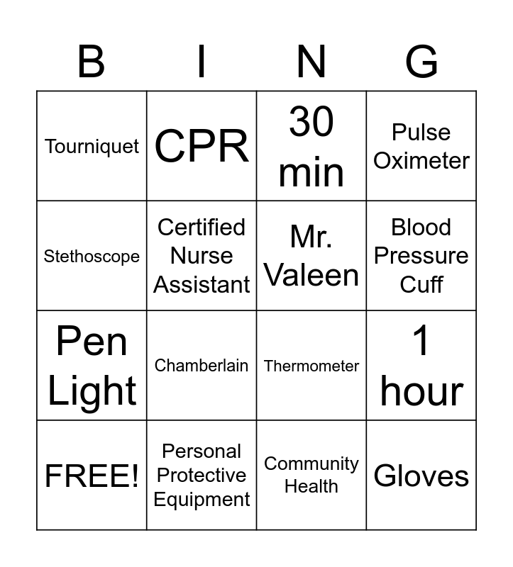 This bingo card has 16 words: Personal Protective Equipment, 1 hour, 30 min, Tourniquet, Pen Light, CPR, Thermometer, Community Health, Stethoscope, Certified Nurse Assistant, FREE!, Pulse Oximeter, Chamberlain, Blood Pressure Cuff, Mr. Valeen and Gloves.