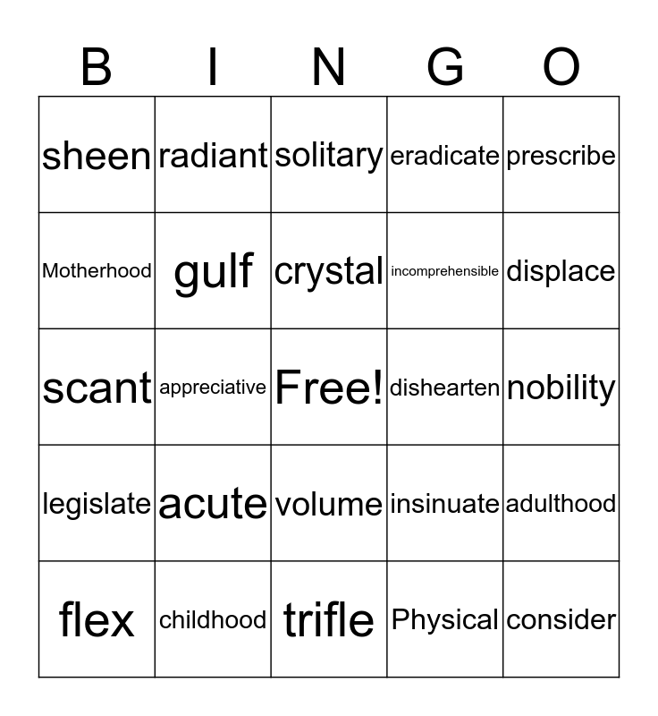 This bingo card has a free space and 24 words: acute, childhood, crystal, flex, prescribe, sheen, Motherhood, radiant, dishearten, volume, incomprehensible, scant, insinuate, adulthood, gulf, Physical, nobility, solitary, displace, appreciative, consider, legislate, eradicate and trifle.