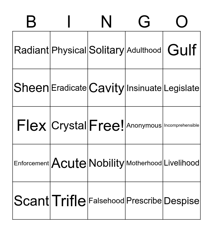 This bingo card has a free space and 24 words: Acute, Trifle, Cavity, Scant, Gulf, Radiant, Sheen, Physical, Anonymous, Nobility, Insinuate, Flex, Motherhood, Livelihood, Eradicate, Prescribe, Incomprehensible, Solitary, Legislate, Crystal, Despise, Enforcement, Adulthood and Falsehood.