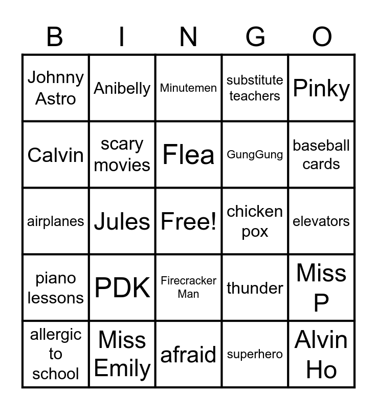 This bingo card has a free space and 25 words: PDK, afraid, Flea, allergic to school, Pinky, Johnny Astro, Calvin, Anibelly, chicken pox, Firecracker Man, GungGung, airplanes, thunder, Miss P, scary movies, be a gentleman, elevators, Minutemen, baseball cards, Jules, Alvin Ho, Miss Emily, piano lessons, substitute teachers and superhero.