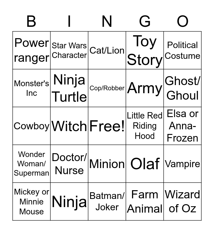 This bingo card has a free space and 31 words: Batman/ Joker, Disney Princess, Witch, Spiderman, Power ranger, Cat/Lion, Ninja Turtle, Olaf, Little Red Riding Hood, Farm Animal, Elsa or Anna- Frozen, Wizard of Oz, Angel/ Devil, Zombie/ Walking Dead Character, Ghost/ Ghoul, Pirate, Vampire, Doctor/ Nurse, Wonder Woman/ Superman, Minion, Political Costume, Clown, Mickey or Minnie Mouse, Star Wars Character, Army, Monster's Inc, Toy Story, Cowboy, Ninja, Cop/Robber and Inmate.