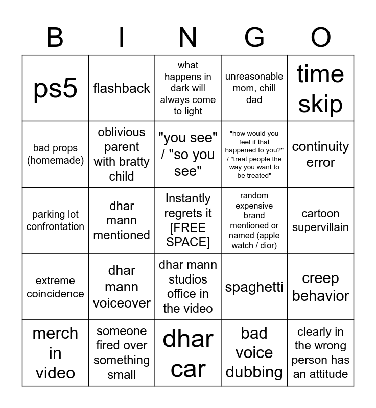 This bingo card has a free space and 25 words: dhar mann voiceover, dhar car, "you see" / "so you see", merch in video, time skip, ps5, bad props (homemade), flashback, random expensive brand mentioned or named (apple watch / dior), dhar mann studios office in the video, "how would you feel if that happened to you?" / "treat people the way you want to be treated", parking lot confrontation, spaghetti, creep behavior, oblivious parent with bratty child, kids with ipad, cartoon supervillain, what happens in dark will always come to light, continuity error, dhar mann mentioned, clearly in the wrong person has an attitude, someone fired over something small, extreme coincidence, unreasonable mom, chill dad and bad voice dubbing.