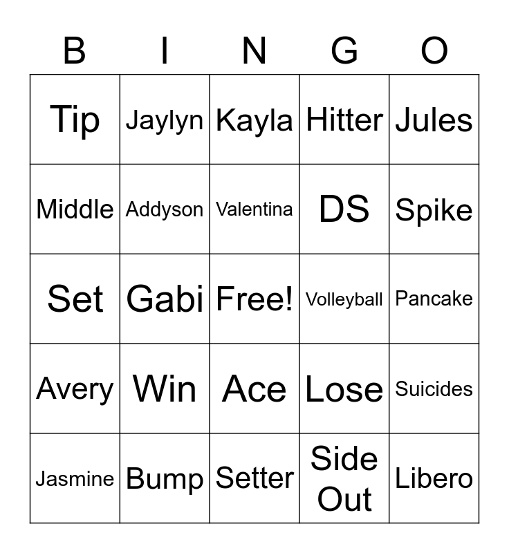 This bingo card has a free space and 33 words: Kiwi, Coach Spencer, Gabi, Kimora, Avery, Addyson, Jules, Jasmine, Jaylyn, Mel, Valentina, Kayla, Diangely, Sky, Volleyball, Spike, Bump, Set, Win, Lose, Ace, Dig, Tip, Pancake, Setter, Libero, Hitter, DS, Middle, Suicides, Net, Side Out and Double.