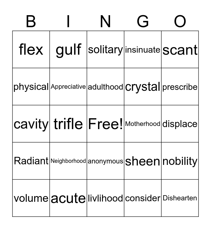 This bingo card has a free space and 24 words: Neighborhood, acute, adulthood, volume, scant, flex, physical, gulf, Motherhood, anonymous, crystal, cavity, sheen, nobility, Appreciative, consider, displace, solitary, prescribe, trifle, Dishearten, Radiant, insinuate and livlihood.