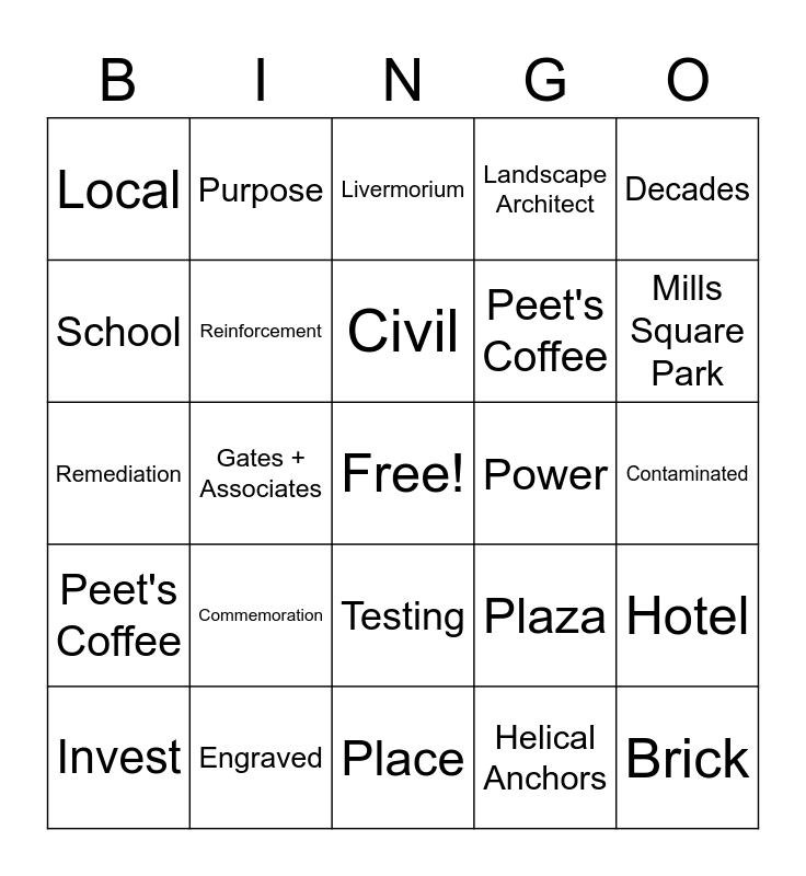 This bingo card has a free space and 24 words: Commemoration, Engraved, Civil, Invest, Decades, Local, School, Purpose, Power, Testing, Peet's Coffee, Remediation, Plaza, Hotel, Reinforcement, Helical Anchors, Contaminated, Livermorium, Mills Square Park, Gates + Associates, Brick, Peet's Coffee, Landscape Architect and Place.