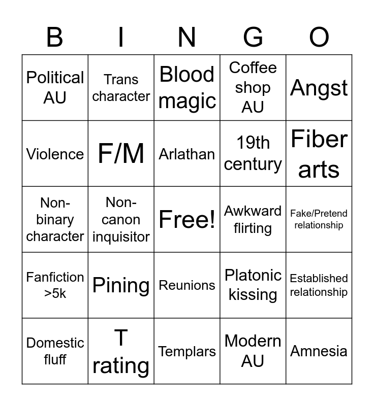 This bingo card has a free space and 58 words: G rating, T rating, Fanart, Fanfiction >5k, Modern AU, M/M, F/M, F/F, 19th century, Alternate universe, Coffee shop AU, College AU, Fairy tale AU, Historical AU, Modern AU, Political AU, Amnesia, Angst, Archdemons, Arlathan, Awkward flirting, Blood magic, Domestic fluff, Established relationship, Evil inquisitor, Fake/Pretend relationship, Falling in love, Family, Fiber arts, First kiss, Fluff, Friends to lovers, Friendship, Horror, Hospitals, Humor, Hurt/Comfort, Non-canon inquisitor, Non-binary character, Panic attacks, Pining, Pirates, Platonic kissing, Politics, Polyamory, Pre-Canon, Post-canon, Reunions, Templars, Temporary Amnesia, The Hanged Man, The Blight, The Qun, Titans, Trans character, Vampires, Violence and Western.