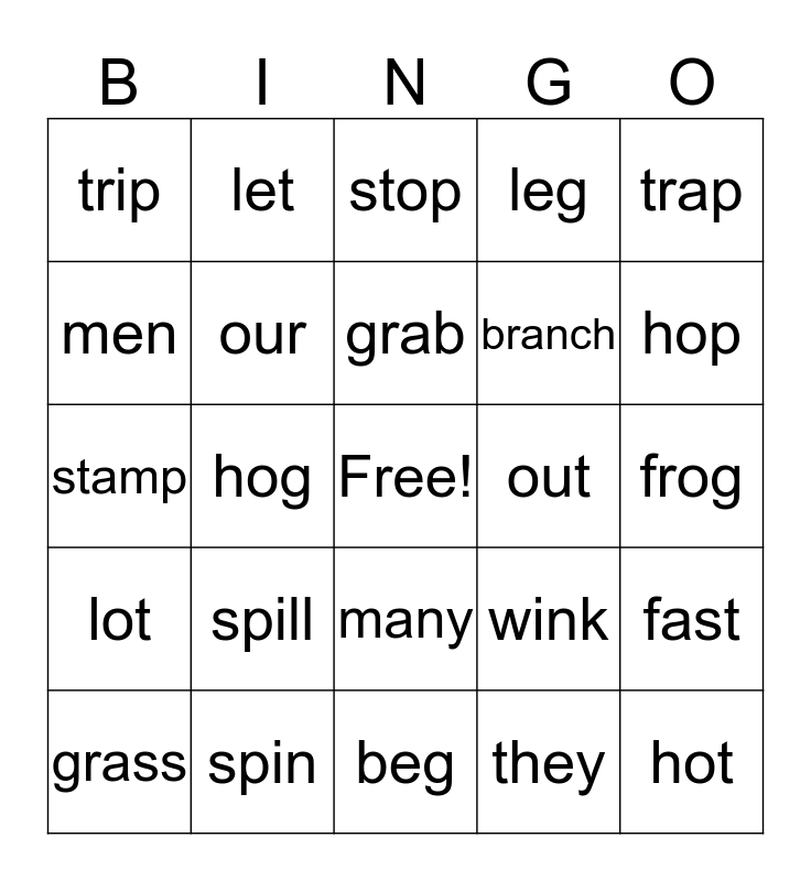 This bingo card has a free space and 24 words: spill, spin, grab, grass, trap, trip, men, let, out, many, branch, stamp, wink, fast, our, they, frog, stop, hop, hog, hot, lot, leg and beg.