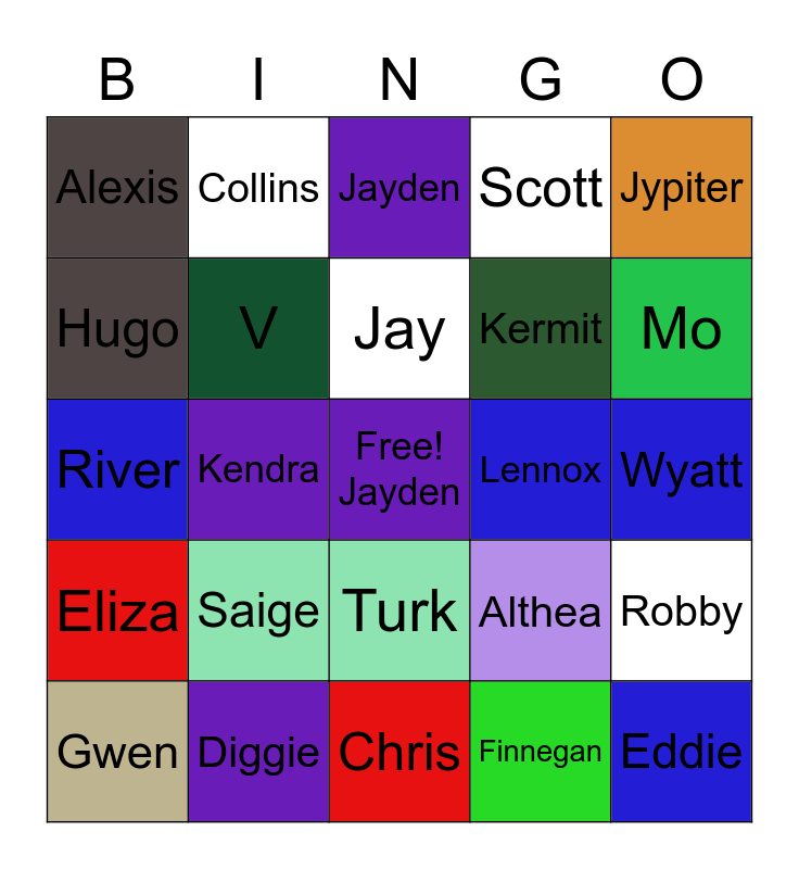 This bingo card has a free space and 29 words: Gwen, Ryley, Kendra, Josh, Alexis, Jayden, V, Saige, Lennox, Diggie, Wyatt, Eddie, Chris, Finnegan, Mo, Jasper, Turk, Eliza, Jypiter, River, Althea, Cali, Kermit, Hugo, Scott, Collins, Robby, Jay and Kara.