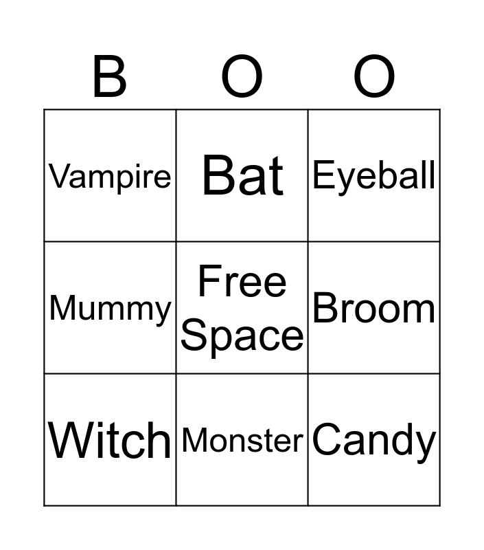 This bingo card has a free space and 14 words: Pumpkin, Skeleton, Witch, Bat, Mummy, Candy, Cat, Jack-o-Lantern, Monster, Vampire, Ghost, Broom, Eyeball and Bones.