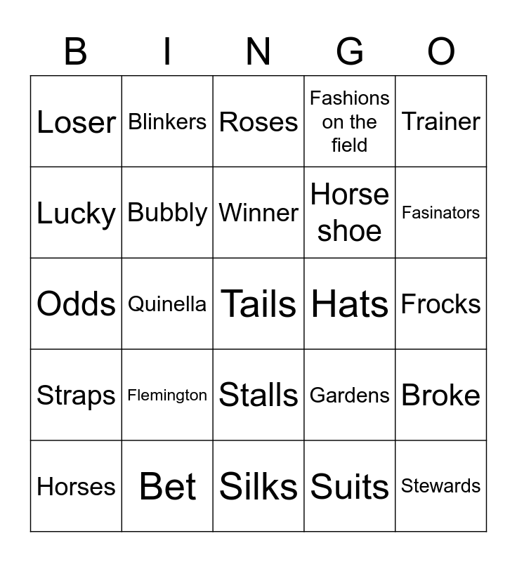 This bingo card has 34 words: Stewards, Suits, Flowers, Heals, Straps, Bubbly, Trainer, Horses, Blinkers, Strapper, Winner, Roses, Cup, Trifecta, Hats, Fasinators, Bet, Odds, Flemington, Gardens, Stalls, Jockey, Loser, Frocks, Silks, Tails, Fashions on the field, Money, Horse shoe, Lucky, Win and Place, Quinella, Broke and Race.