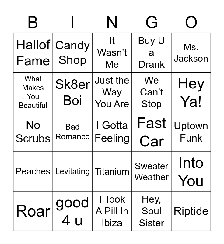 This bingo card has 75 words: Yeah!, Crazy in Love, It Wasn’t Me, Hollaback Girl, Beautiful Girls, Black and Yellow, Stronger, Poker Face, Bye Bye Bye, Replay, Riptide, The Real Slim Shady, Just the Way You Are, What Makes You Beautiful, Baby, Bad Romance, Dynamite, I Gotta Feeling, Hips Don’t Lie, Ms. Jackson, Toxic, No Scrubs, Sk8er Boi, Candy Shop, Buy U a Drank, …Baby One More Time, Glamorous, Pon de Replay, I Want It That Way, Promiscuous, Shake It, Mirrors, Classic, Sweater Weather, Hey Ya!, We Can’t Stop, TiK ToK, Since U Been Gone, Uptown Funk, Hey, Soul Sister, Umbrella, Single Ladies, Drop It Like It’s Hot, Hot N Cold, Party In The U.S.A, Thrift Shop, Roar, Hallof Fame, One Dance, Rolling in the Deep, We Are Young, Titanium, Last Friday Night, Super Bass, Somebody That I Used To Know, STAY, Mr. Brightside, Call Me Maybe, Roll Up, Sunflower, Levitating, Watermelon Sugar, Closer, 24K Magic, Payphone, Fast Car, Better Now, Senorita, Hotline Bling, Into You, Peaches, good 4 u, Old Town Road, I Took A Pill In Ibiza and Work.
