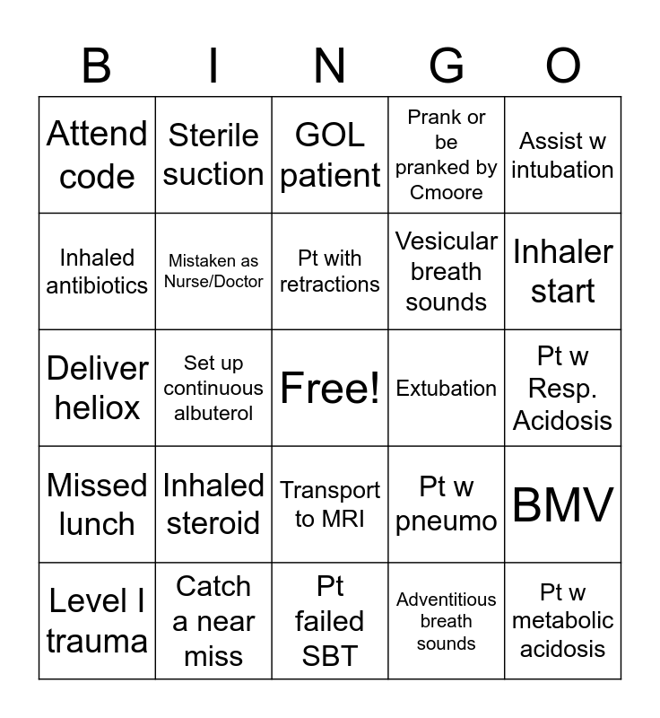 This bingo card has a free space and 24 words: Inhaled steroid, Catch a near miss, Pt with retractions, Level I trauma, Assist w intubation, Attend code, Inhaled antibiotics, Sterile suction, Extubation, Transport to MRI, Vesicular breath sounds, Deliver heliox, Pt w pneumo, BMV, Mistaken as Nurse/Doctor, Adventitious breath sounds, Pt w Resp. Acidosis, GOL patient, Inhaler start, Set up continuous albuterol, Pt w metabolic acidosis, Missed lunch, Prank or be pranked by Cmoore and Pt failed SBT.
