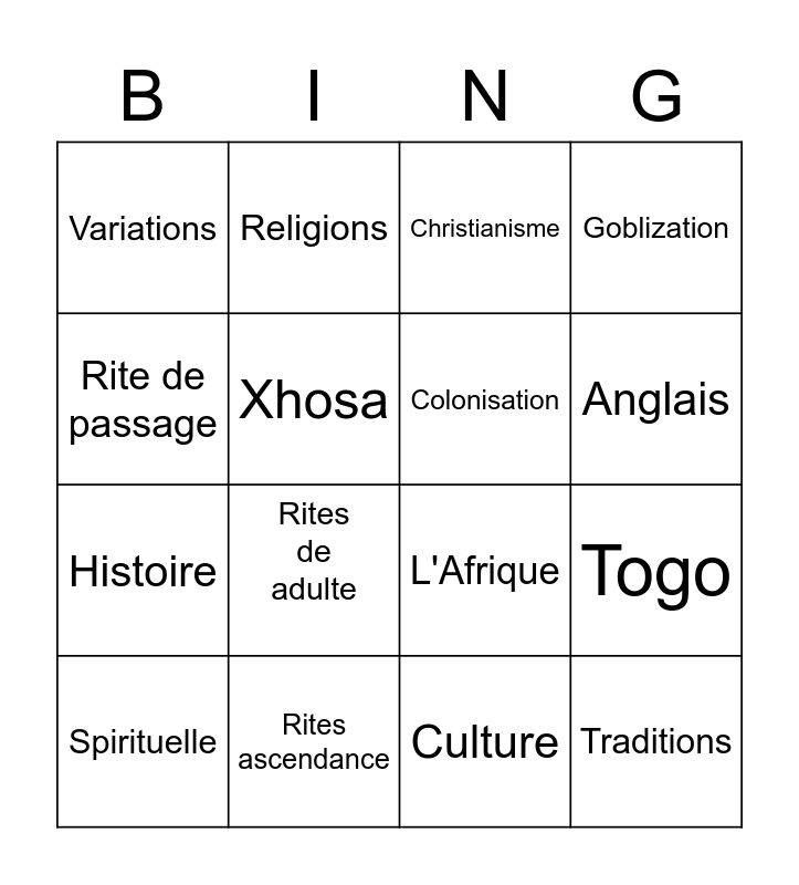 This bingo card has 16 words: Rites ascendance, Togo, Christianisme, Variations, Histoire, Religions, L'Afrique, Culture, Rite de passage, Xhosa, Spirituelle, Goblization, Rites de adulte, Anglais, Colonisation and Traditions.