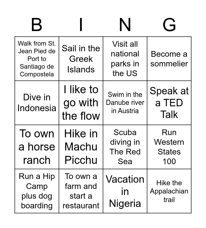 This bingo card has 16 words: To own a farm and start a restaurant, Run Western States 100, Visit all national parks in the US, Walk from St. Jean Pied de Port to Santiago de Compostela, To own a horse ranch, Sail in the Greek Islands, Scuba diving in The Red Sea, Vacation in Nigeria, Dive in Indonesia, I like to go with the flow, Run a Hip Camp plus dog boarding, Become a sommelier, Hike in Machu Picchu, Speak at a TED Talk, Swim in the Danube river in Austria and Hike the Appalachian trail.