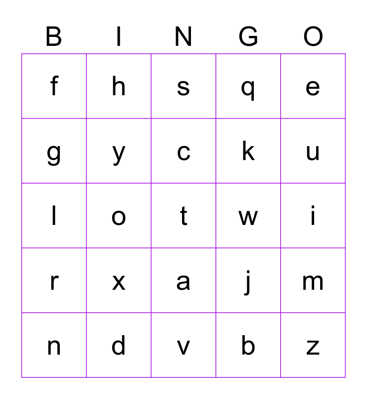 This bingo card has 26 words: a, b, c, d, e, f, g, h, i, j, k, l, m, n, o, p, q, r, s, t, u, v, w, x, y and z.