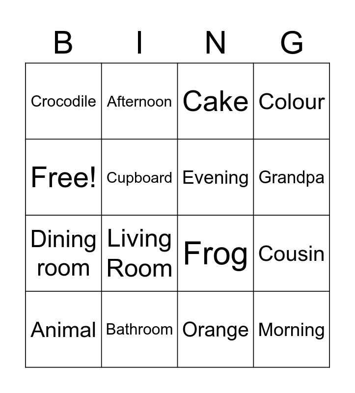 This bingo card has 17 words: Animal, Bathroom, Cake, Colour, Dining room, Cupboard, Frog, Grandpa, Free!, Living Room, Orange, Cousin, Crocodile, Afternoon, Evening, Morning and Purple.