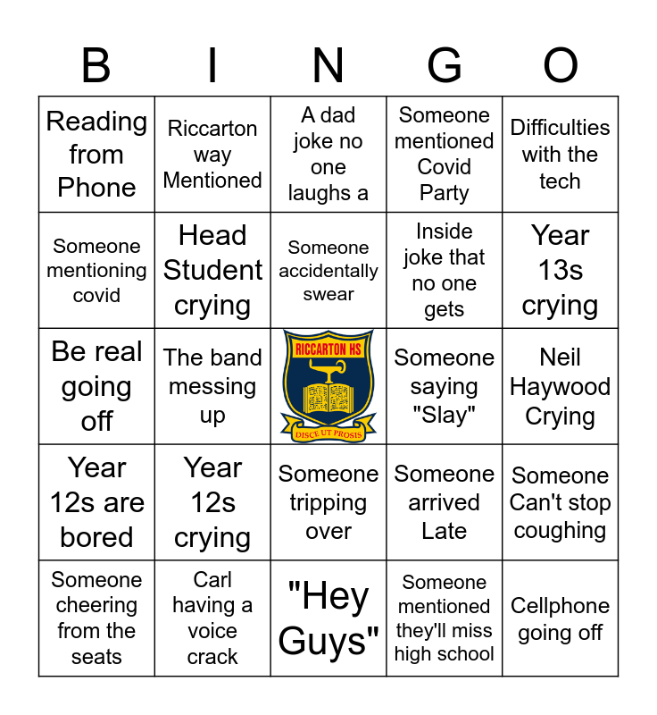 This bingo card has a free space and 24 words: Someone cheering from the seats, Year 12s crying, Someone accidentally swear, Someone mentioned they'll miss high school, Difficulties with the tech, Reading from Phone, Riccarton way Mentioned, A dad joke no one laughs a, Someone saying "Slay", Neil Haywood Crying, Be real going off, Head Student crying, Someone arrived Late, Someone Can't stop coughing, Someone mentioning covid, Carl having a voice crack, "Hey Guys", Someone mentioned Covid Party, Year 13s crying, Year 12s are bored, The band messing up, Someone tripping over, Inside joke that no one gets and Cellphone going off.