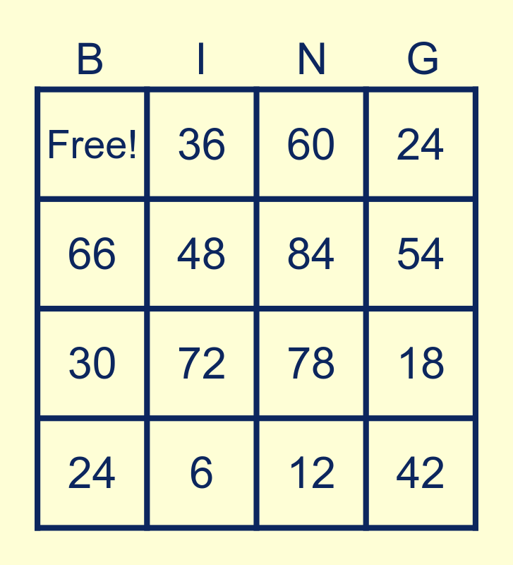 This bingo card has 16 words: 24, 6, 60, 24, 66, 36, 78, 18, Free!, 48, 12, 54, 30, 72, 84 and 42.