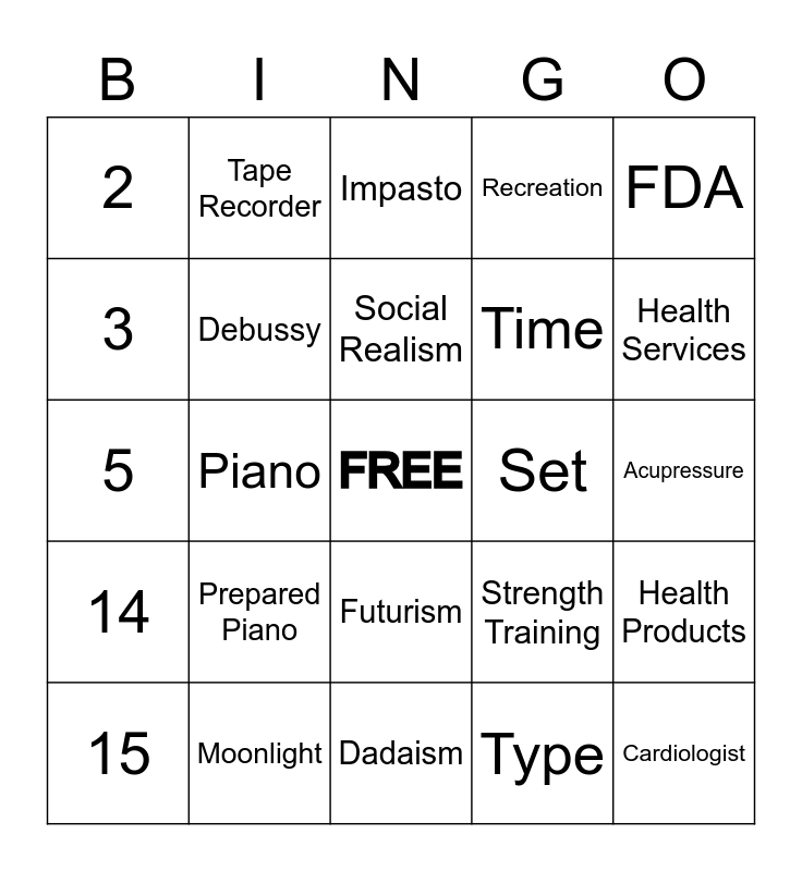 This bingo card has a free space and 49 words: 12, Theremin, Picasso, Type, Acupressure, 11, Tape Recorder, Pop Art, Time, Acupuncture, 3, Piano, Strength Training, Cardiologist, 6, La Mer, Impasto, Set, Consumer Health, 2, Moonlight, Dadaism, Recreation, FDA, 8, Prepared Piano, Social Realism, Volleyball, Health Products, 14, John Cage, Futurism, Soccer, Health Professional, 15, Impressio nism, Cubism, Intensity, Health Services, 9, Electronic, Renoir, Galaw Pilipinas, Hospital, 5, Debussy, Manet, Frequency and Pag-ibig.