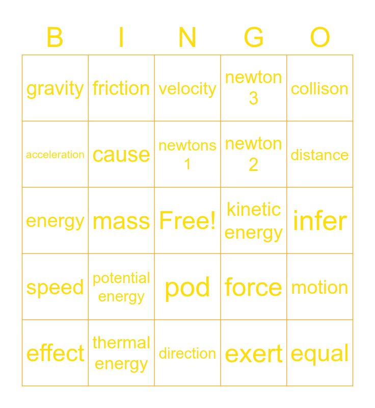 This bingo card has a free space and 24 words: potential energy, thermal energy, newtons 1, effect, collison, gravity, acceleration, friction, kinetic energy, pod, newton 2, energy, force, motion, cause, exert, infer, velocity, distance, mass, equal, speed, newton 3 and direction.