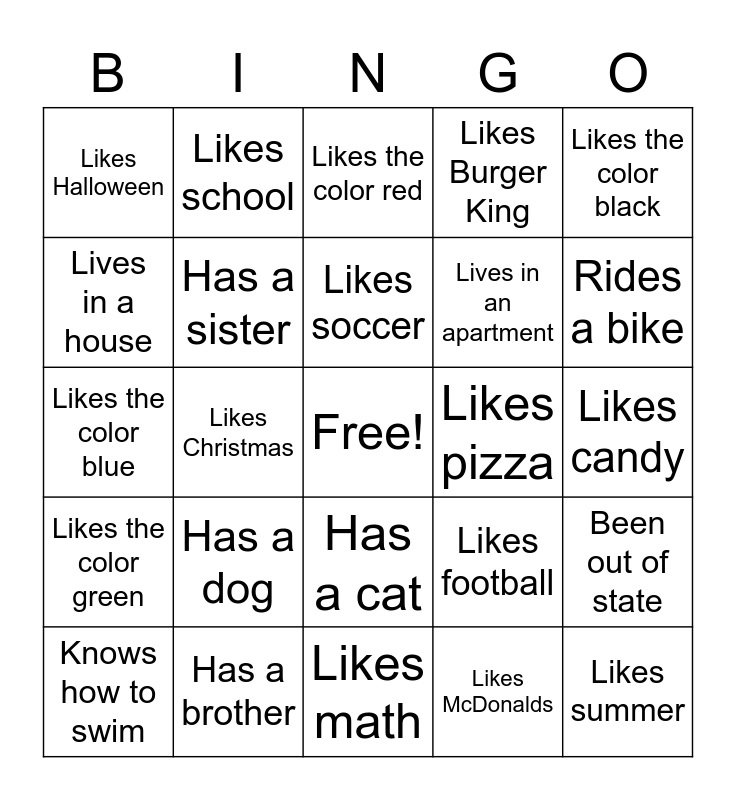 This bingo card has a free space and 24 words: Has a dog, Has a brother, Likes soccer, Knows how to swim, Likes the color black, Likes Halloween, Lives in a house, Likes school, Likes pizza, Has a cat, Lives in an apartment, Likes the color blue, Likes football, Been out of state, Has a sister, Likes McDonalds, Likes candy, Likes the color red, Rides a bike, Likes Christmas, Likes summer, Likes the color green, Likes Burger King and Likes math.