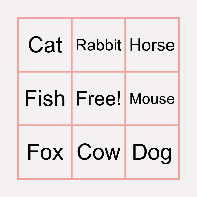 This bingo card has a free space and 10 words: Cow, Horse, Cat, Dog, Fish, Fox, Rabbit, Goat, Mouse and Bird.