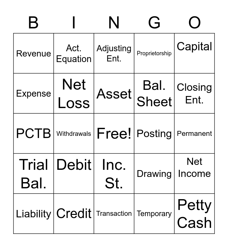 This bingo card has a free space and 24 words: Debit, Credit, Asset, Liability, Capital, Revenue, Expense, Act. Equation, Posting, Inc. St., Bal. Sheet, PCTB, Drawing, Net Income, Net Loss, Temporary, Permanent, Adjusting Ent., Closing Ent., Withdrawals, Petty Cash, Trial Bal., Proprietorship and Transaction.