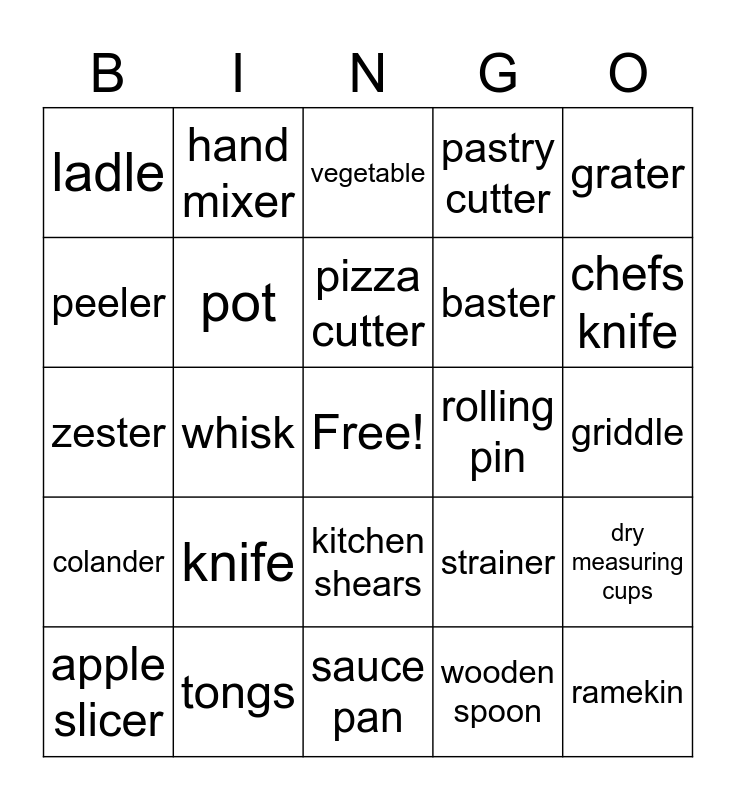 This bingo card has a free space and 24 words: knife, tongs, pizza cutter, apple slicer, grater, ladle, peeler, hand mixer, rolling pin, kitchen shears, baster, zester, strainer, dry measuring cups, pot, wooden spoon, griddle, vegetable, chefs knife, whisk, ramekin, colander, pastry cutter and sauce pan.