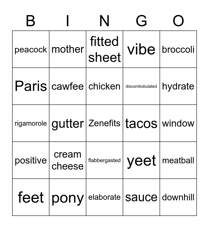 This bingo card has a free space and 24 words: cream cheese, pony, chicken, feet, broccoli, peacock, Paris, mother, tacos, flabbergasted, discombobulated, rigamorole, yeet, meatball, cawfee, sauce, window, fitted sheet, hydrate, gutter, downhill, positive, vibe and elaborate.
