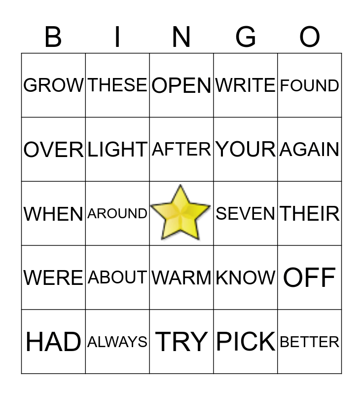 This bingo card has a free space and 24 words: ABOUT, ALWAYS, AFTER, HAD, FOUND, GROW, OVER, THESE, SEVEN, WARM, YOUR, WHEN, KNOW, OFF, LIGHT, PICK, THEIR, OPEN, AGAIN, AROUND, BETTER, WERE, WRITE and TRY.