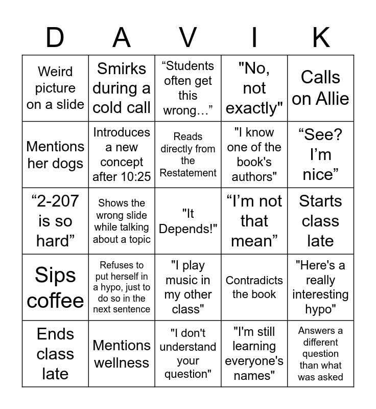 This bingo card has a free space and 33 words: Complains about not enough sleep, Spends at least 10 minutes on a tangent, Shows the wrong slide while talking about a topic, UCC is a SALE of GOODS, Sips coffee, Introduces a new concept after 10:25, Calls on Allie, Ends class late, Smirks during a cold call, "I need more coffee", Reads directly from the Restatement, “Students often get this wrong…”, “TMI, but I’m gonna tell you anyway”, Lets a wrong answer go too long, “I’m not that mean”, “See? I’m nice”, Mentions wellness, “2-207 is so hard”, Refuses to put herself in a hypo, just to do so in the next sentence, Contradicts the book, "I play music in my other class", Questions where someone sits, Weird picture on a slide, Starts class late, "I don't understand your question", Answers a different question than what was asked, "No, not exactly", "I know one of the book's authors", Mentions her dogs, "Here's a really interesting hypo", Talks around a word she forgot, "I'm still learning everyone's names" and "It's been a long morning".