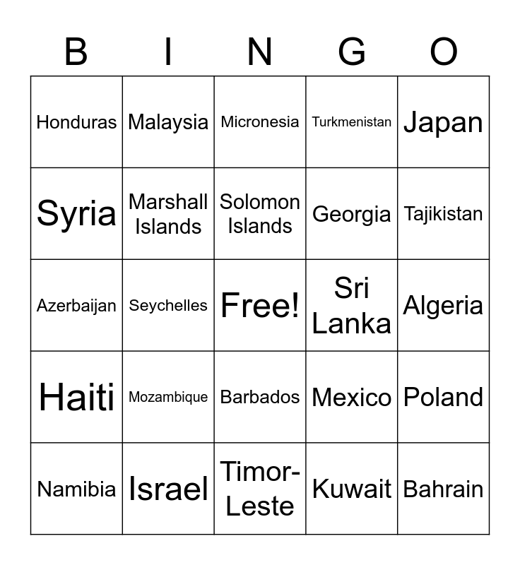 This bingo card has a free space and 173 words: Tolerance, E, Afghanistan, Albania, Algeria, Andorra, Angola, Antigua, Argentina, Armenia, Australia, Austria, Azerbaijan, Bahamas, Bahrain, Bangladesh, Barbados, Belarus, Belgium, Belize, Bhutan, Bolivia, Bosnia, Botswana, Brazil, Brunei, Bulgaria, Burundi, Cambodia, Cameroon, Canada, Chad, Chile, China, Colombia, Congo, Costa Rica, Croatia, Cuba, Cyprus, Czech Republic, Denmark, Dominican Republic, Ecuador, Egypt, El Salvador, Estonia, Ethiopia, Fiji, Finland, France, Gambia, Georgia, Germany, Ghana, Greece, Grenada, Guatemala, Guinea, Guyana, Haiti, Honduras, Hungary, Iceland, India, Indonesia, Iran, Iraq, Ireland, Israel, Italy, Jamaica, Japan, Jordan, Kazakhstan, Kenya, Kuwait, Kyrgyzstan, Laos, Latvia, Lebanon, Lesotho, Liberia, Libya, Liechtenstein, Lithuania, Luxembourg, Madagascar, Malawi, Malaysia, Maldives, Mali, Malta, Marshall Islands, Mexico, Micronesia, Moldova, Monaco, Mongolia, Montenegro, Morocco, Mozambique, Myanmar, Namibia, Nauru, Nepal, Netherlands, New Zealand, Nicaragua, Niger, Nigeria, North Korea, North Macedonia, Norway, Oman, Pakistan, Palau, Palestine State, Panama, Papua New Guinea, Paraguay, Peru, Philippines, Poland, Portugal, Qatar, Romania, Russia, Rwanda, Saint Lucia, Samoa, San Marino, Saudi Arabia, Senegal, Serbia, Seychelles, Sierra Leone, Singapore, Slovakia, Slovenia, Solomon Islands, Somalia, South Africa, South Korea, South Sudan, Spain, Sri Lanka, Sudan, Sweden, Switzerland, Syria, Tajikistan, Tanzania, Thailand, Timor-Leste, Togo, Tonga, Trinidad and Tobago, Tunisia, Turkey, Turkmenistan, Uganda, Ukraine, United Arab Emirates, United Kingdom, United States of America, Uruguay, Uzbekistan, Venezuela, Vietnam, Yemen, Zambia and Zimbabwe.