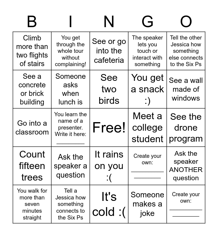 This bingo card has a free space and 24 words: Ask the speaker a question, Tell a Jessica how something connects to the Six Ps, See two birds, You walk for more than seven minutes straight, Tell the other Jessica how something else connects to the Six Ps, Climb more than two flights of stairs, See a concrete or brick building, You get through the whole tour without complaining!, Meet a college student, It rains on you :(, You get a snack :), Go into a classroom, Create your own: ___________ _________, Ask the speaker ANOTHER question, Someone asks when lunch is, Someone makes a joke, See the drone program, See or go into the cafeteria, See a wall made of windows, You learn the name of a presenter. Write it here: _________, Create your own: ___________ _________, Count fifteen trees, The speaker lets you touch or interact with something and It's cold :(.