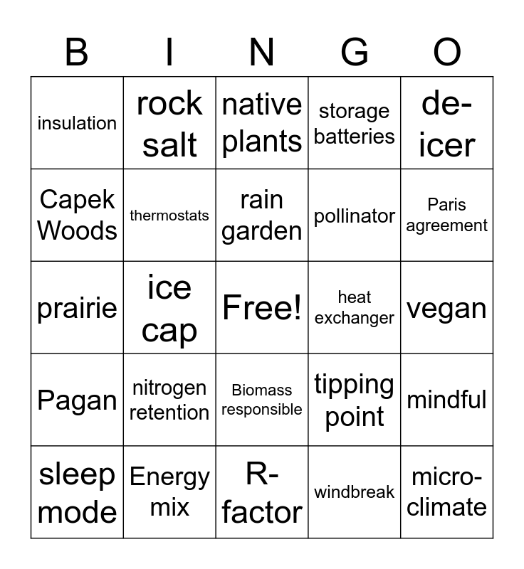 This bingo card has a free space and 55 words: locavore, sleep mode, window covering, insulation, R-factor, solar array, thermostats, recycle, pollinator, tree canopy, storage batteries, net zero, renewable, flood, sharing, goats, de-icer, ice cap, offsets, micro-climate, heat exchanger, compost, tipping point, native plants, reflectivity, rain garden, windbreak, wind power, vegan, mindful, wetland mix, water retention, trees, 96%, Capek Woods, prairie, burr oak, Pagan, brainstorming, Seventh Principle, rock salt, Climate Change Resolution, heat pump, earth centered, nitrogen retention, Energy mix, COP26, Greenwashing, Sustainable, Paris agreement, Fast fashion, Energy transition, Carbon tax, Biomass responsible and interconnected.